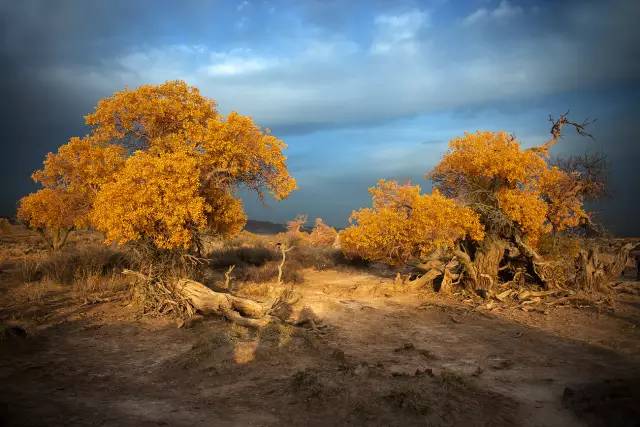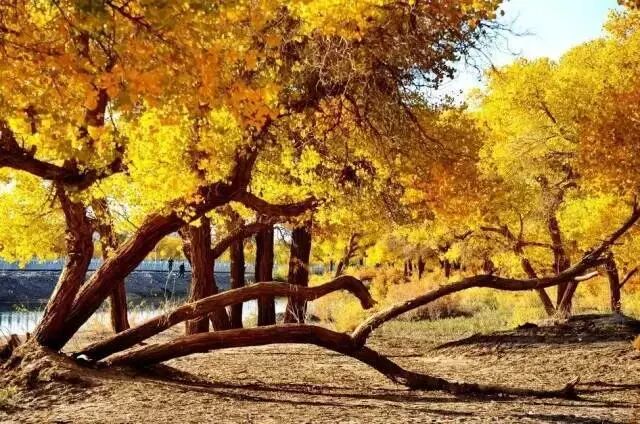 蔚藍(lán)的天空,金黃茂密的樹(shù)葉,干枯猙獰的樹(shù)干,構(gòu)成了一幅幅色彩對(duì)比鮮明,視覺(jué)沖擊力極強(qiáng)的絕美畫(huà)面。