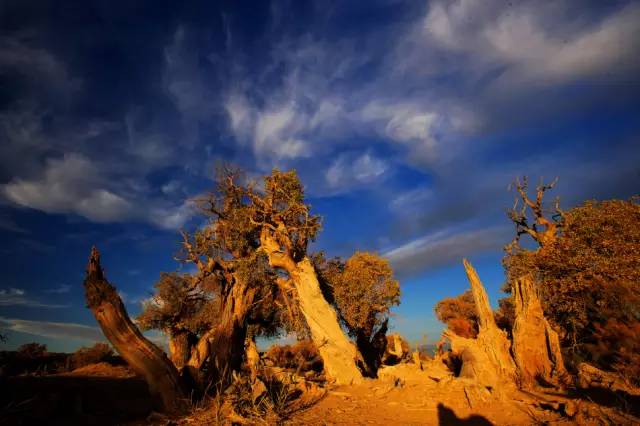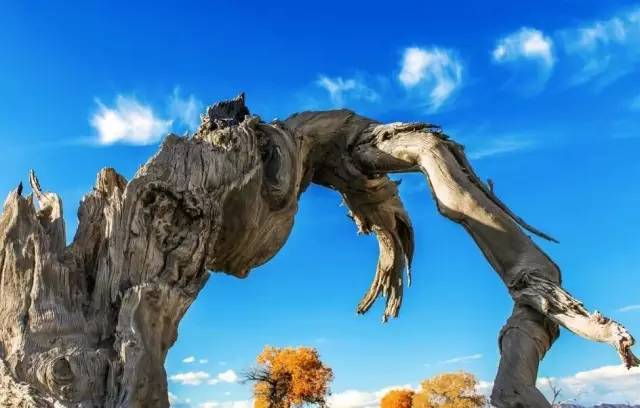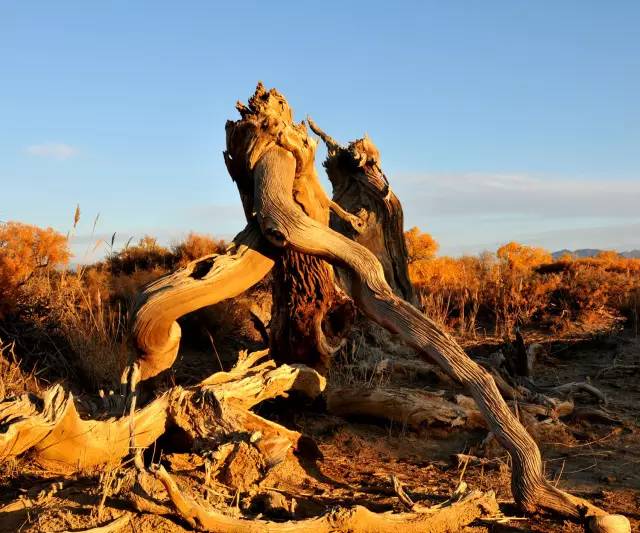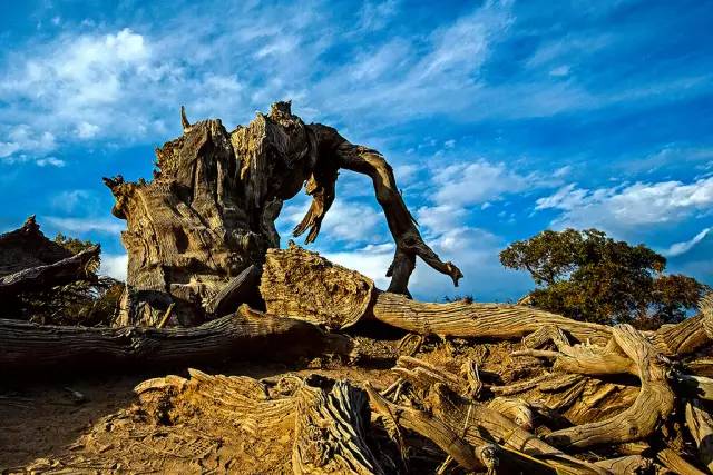 千百年來(lái),它們以頑強(qiáng)的意志抗擊著沙漠的侵蝕。讓人驚嘆的是,這些鐵骨錚錚的樹(shù)干,形狀千姿百態(tài),有的似鯤鵬展翅,有的象駿馬揚(yáng)蹄,還有的如纖纖少女。簡(jiǎn)直就是一座天然藝術(shù)宮殿。有詩(shī)寫(xiě)道:“矮如龍蛇數(shù)變形,蹲如熊虎踞高崗。嬉如神狐九尾,獰如夜叉牙爪張?!?/span>