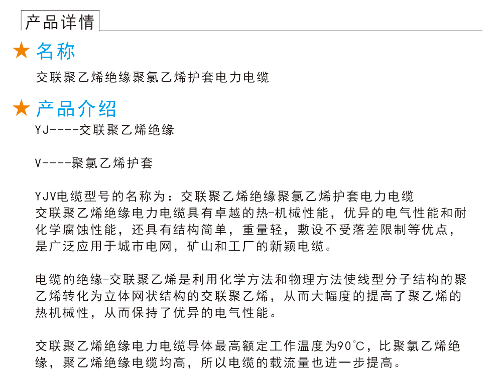 胡楊電力電纜產(chǎn)品給住宅、商業(yè)用建筑、產(chǎn)業(yè)用配電電路提供穩(wěn)定的電力。應(yīng)用于發(fā)生大型火災(zāi)時(shí)防止二次擴(kuò)散的高阻燃場(chǎng)所;醫(yī)院、地下商場(chǎng)、機(jī)場(chǎng)、大型建筑、地鐵等需要高阻燃多重設(shè)施和抑制有害氣體的場(chǎng)所。具備最佳耐熱性能,便于施工和連接。